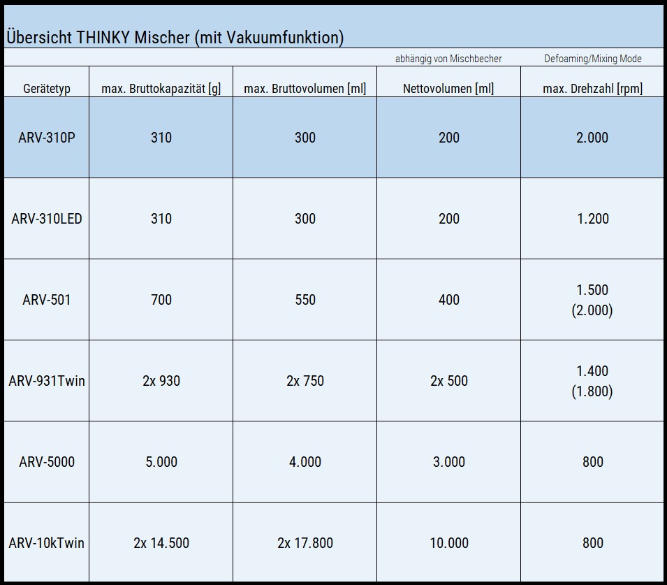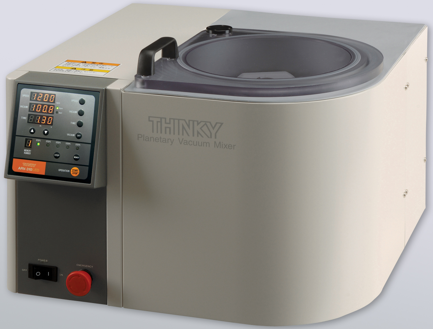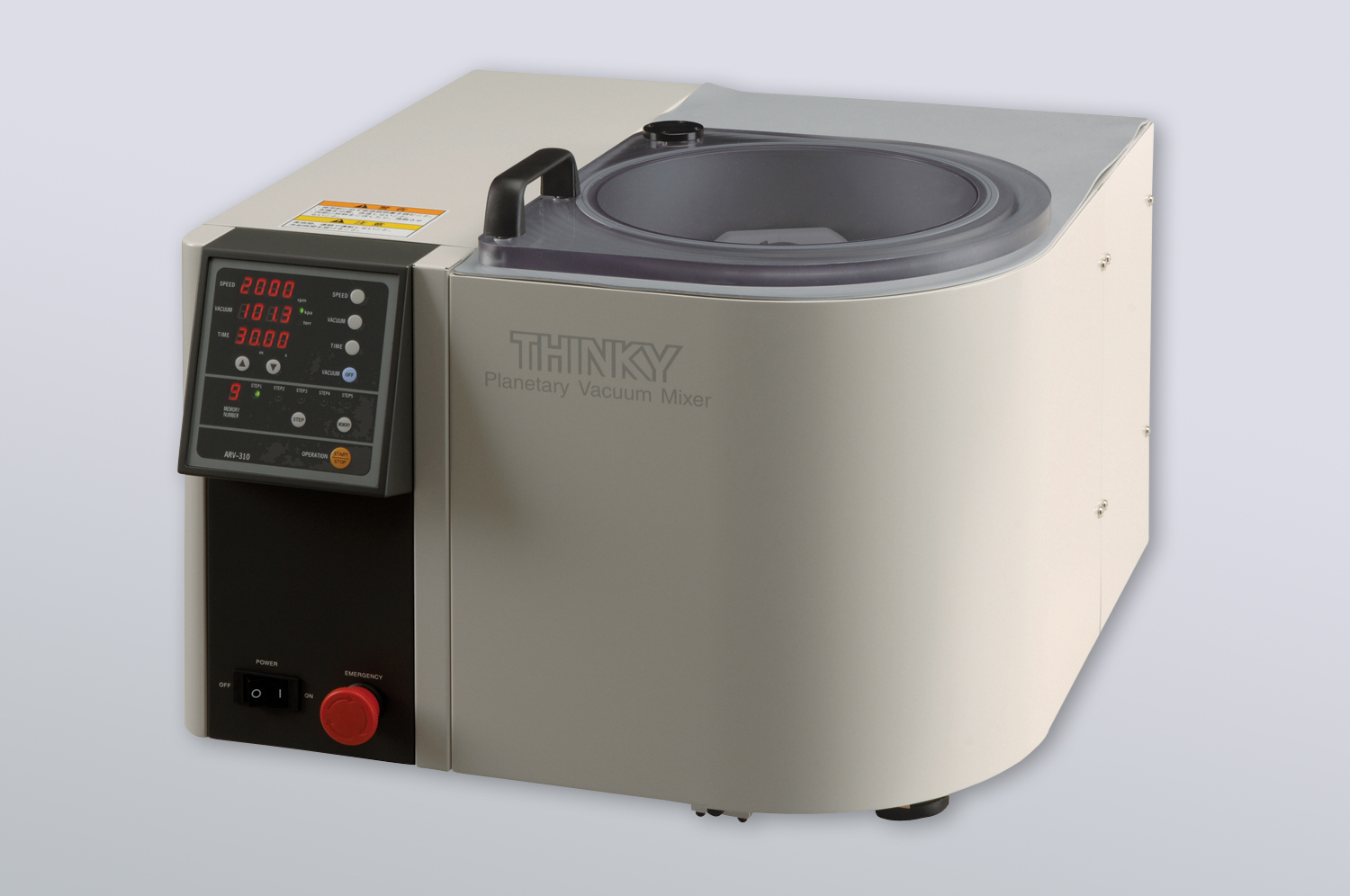 Der ARV-310 und dessen Varianten ARV-310P und ARV-310LED sind kontaktlose Vakuum-Planeten-Zentrifugal-Mischer zum Mischen, Dispergieren und Entgasen von Material in einem einzigen Arbeitsschritt und innerhalb von kurzer Zeit. Dieser hocheffiziente Mischvorgang resultiert aus der Überlagerung zweier Bewegungen des Mischbehälters – einer Zentrifugal- und einer Rotationsbewegung. Da die Technik ohne Rührer auskommt erfolgt auch keine Zerstörung des Probenmaterials z.B. von faserförmigen oder mikrogekapselten Komponenten durch Rührorgane.