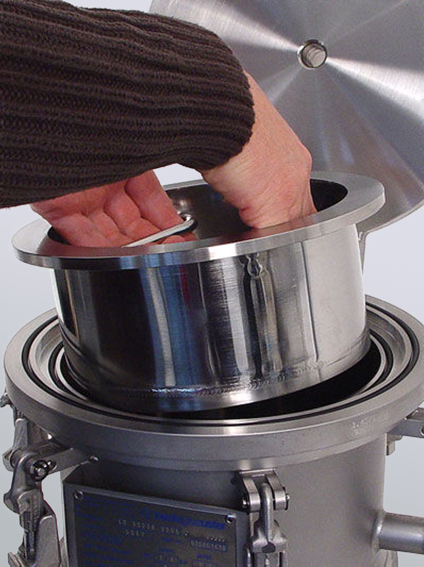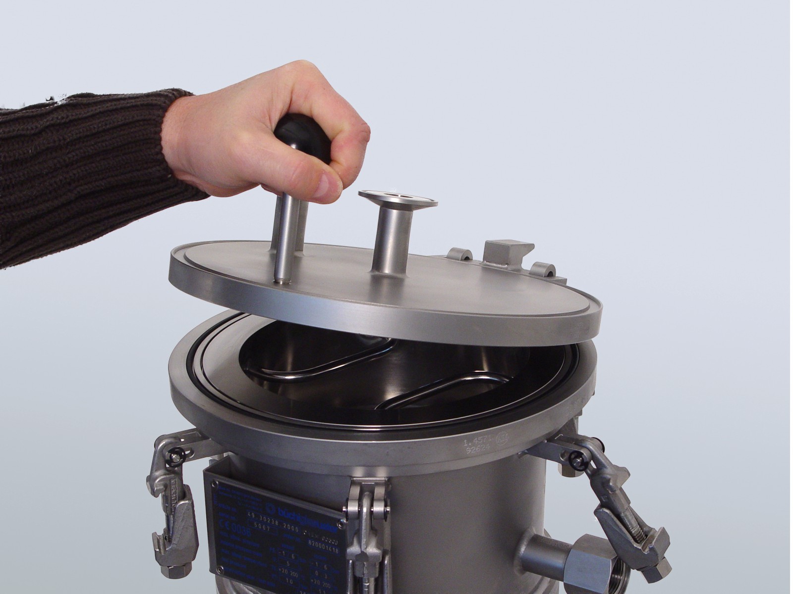 Die Deckelplatte lässt sich einfach und schnell über Klammerschrauben öffnen, die Entnahme des Filterkorbes erfolgt über robuste Griffe am Korb. So kann der Filterkuchen sicher und einfach entnommen werden.