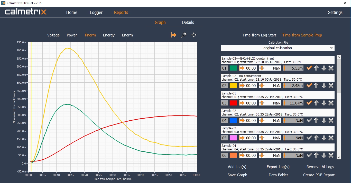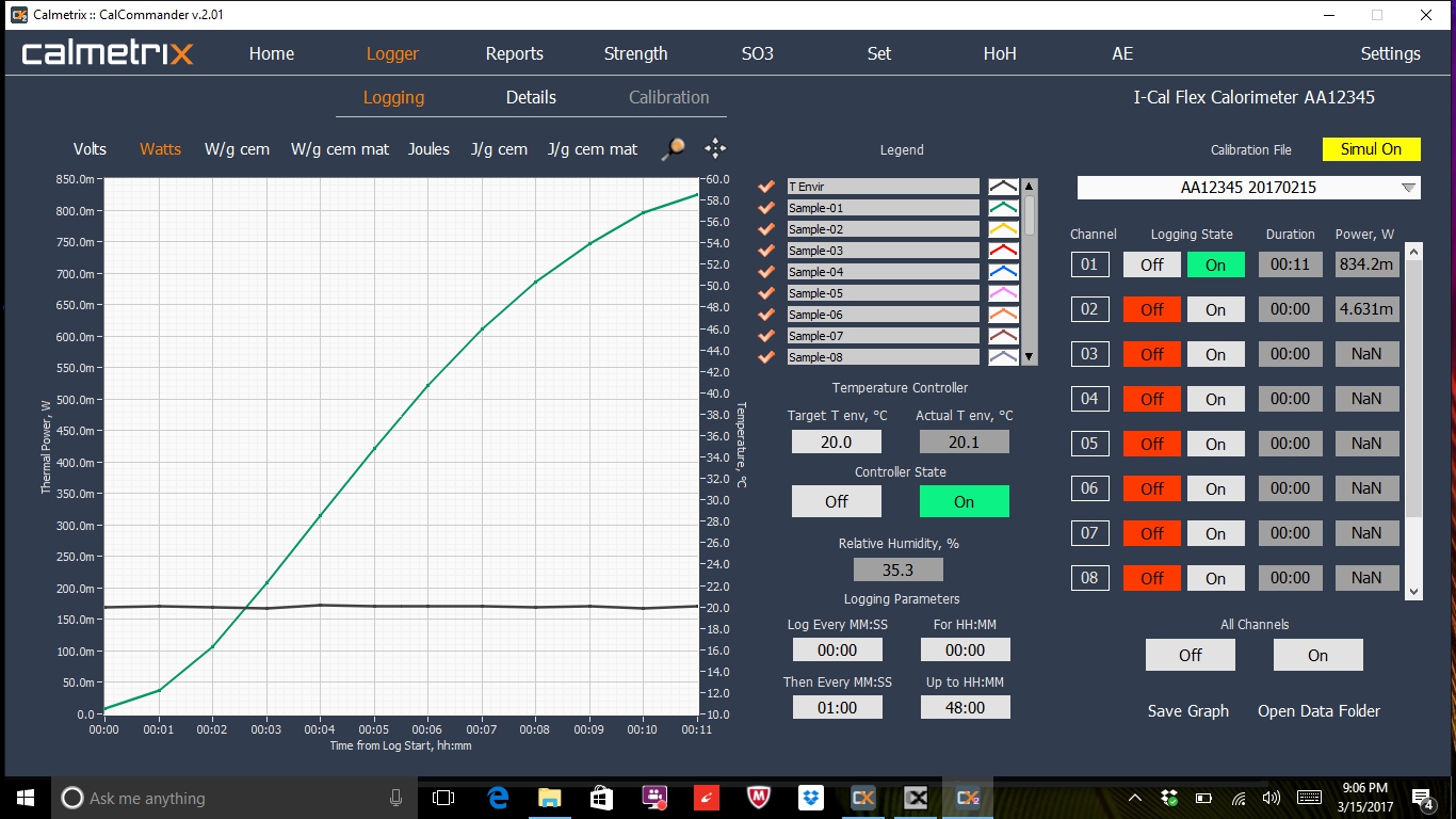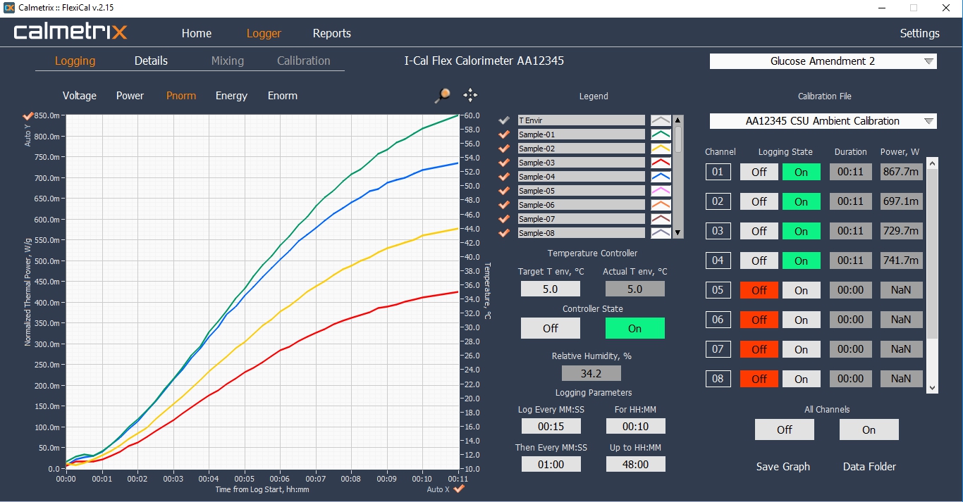 Calmetrix CalCommander I-Cal Logger: Die I-Cal Logger Software steuert die Kalorimeter-Systeme. Der Anwender kann die Aufzeichnung starten oder stoppen und weitere relevante Daten für das Experiment erfassen, die zusammen mit der Wärmeflusskurve gespeichert werden. I-Cal Logger protokolliert und stellt online den Wärmefluss und die Hydratationsenergie als Absolutwerte oder normiert auf die Einwaage von reinem Zement oder der Gesamtmasse des zementartigen Materials dar. Während der Datenaufzeichnung können Zwischenberichte erstellt werden.
