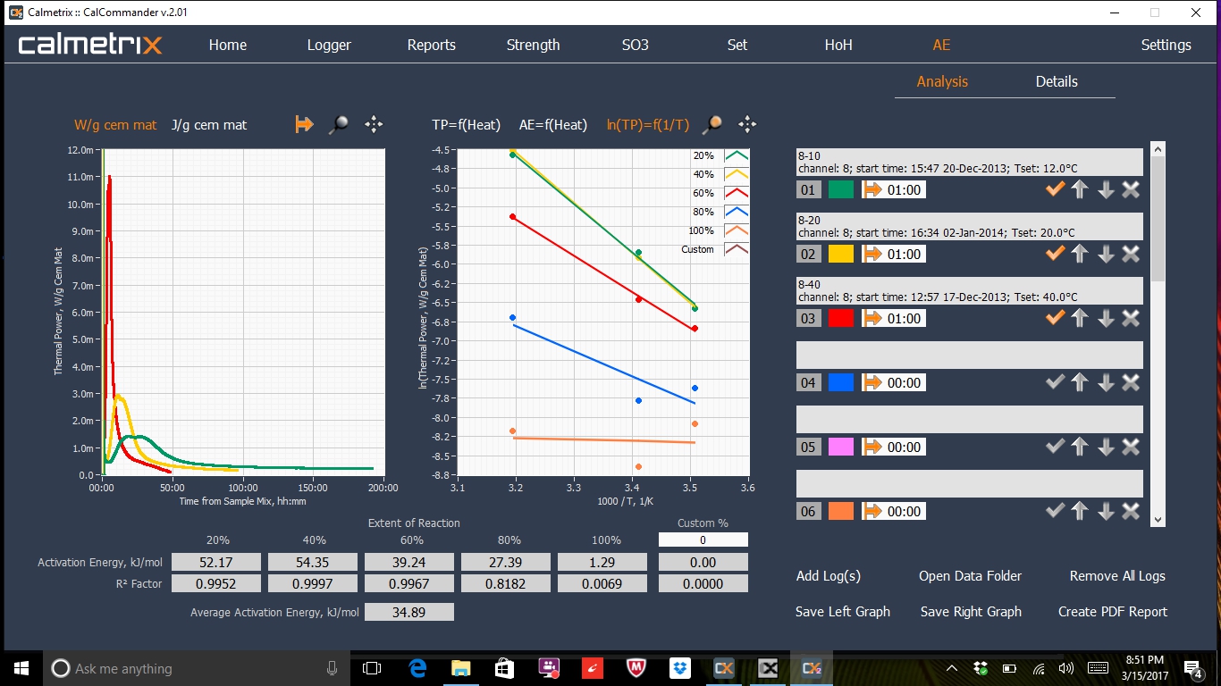 Calmetrix CalCommander I-Cal AE: AE = Aktivierungsenergie wird häufig in Vorhersagen basierend auf dem Reifegrad des Abbindens von Beton verwendet, um auf die Neigung zu Rissen oder einer Druckfestigkeitserhöhung zu schließen. I-Cal AE bestimmt die Aktivierungsenergie einer überwiegend auf Portlandzement basierenden Mischung oder einer hochvolumigen Puzzolanmischung oder auch von alkalisch aktivierten Systemen wie Geopolymere.I-Cal AE stellt auch den Arrhenius-Plot dar, der schnell das Verhalten einer bestimmten Mischung und ihre Empfindlichkeit gegenüber Temperaturschwankungen charakterisiert.
