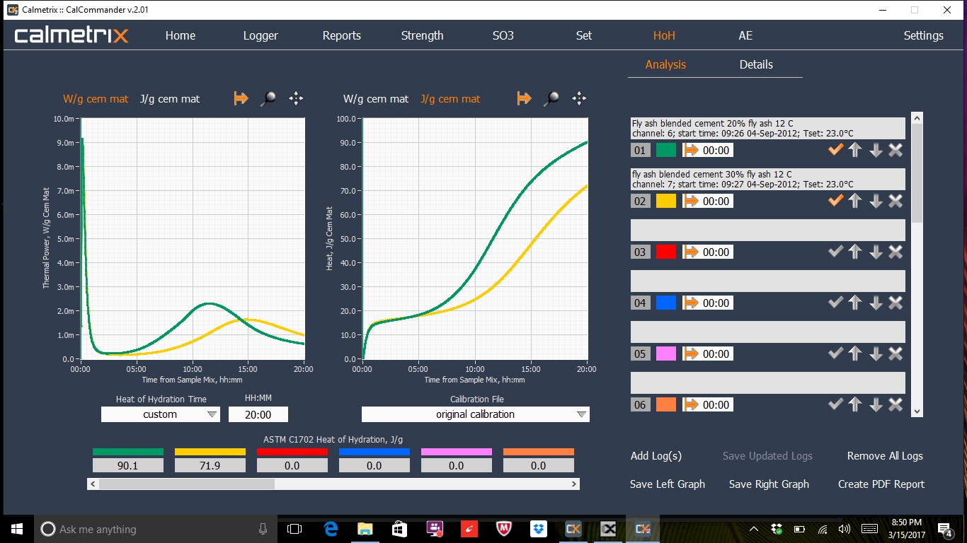 Calmetrix CalCommander I-Cal HoH: I-Cal HoH (HoH = Heat of Hydration / Hydratationswärme) wird verwendet, um den genauen Wert der Hydratationswärme eines Zements oder zementartigen Systems zu bestimmen. Der Benutzer hat die Möglichkeit, Eingabefelder, Berechnungen und Berichte zu verwenden, die für die Verwendung mit der Norm ASTM C1702 ausgelegt sind.