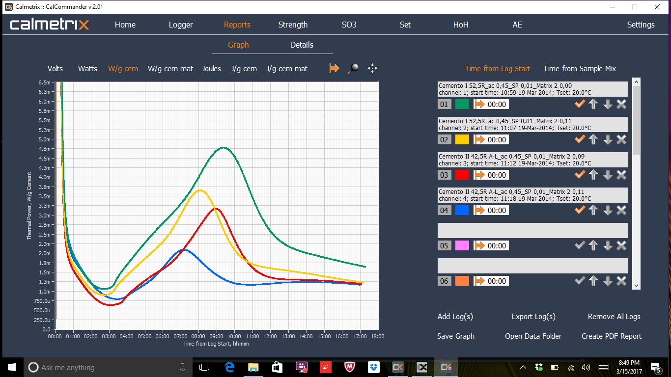 Calmetrix CalCommander I-Cal Reports: I-Cal Reports wird verwendet, um Kurven aus abgeschlossenen Experimenten abzurufen, Teile der Messkurve für eine detailliertere Analyse zu vergrößern, umfassende Berichte zu erstellen oder Diagramme als Bilder zu speichern. Die Diagramme können als Wärmefluss oder Hydratationsenergie als Absolutwerte oder normiert auf das Einheitsgewicht von Zement oder zementartigem Material angezeigt werden. Man kann die Daten zusätzlich in ein Format exportieren, das mit Tabellenkalkulationsprogrammen wie Microsoft Excel oder OpenOffice kompatibel ist.