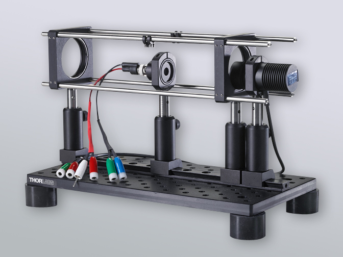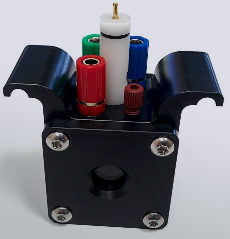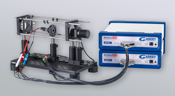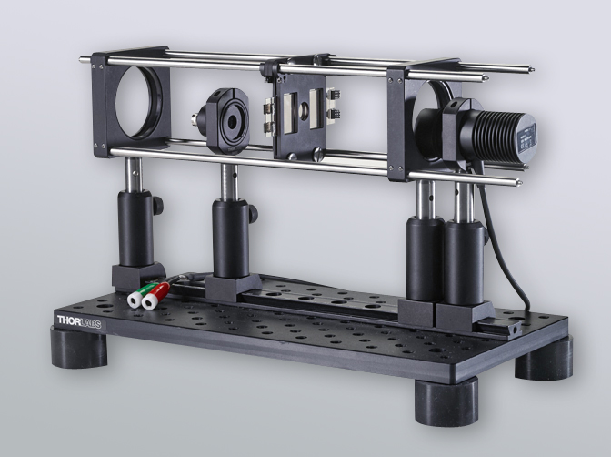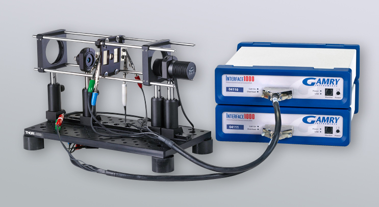 Der Aufbau zur Charakterisierung von Farbstoff-Solarzellen besteht aus einer miniaturisierten optischen Bank zur Unterbringung der LED ausgewählter Wellenlänge, einem Kollimator–Kit), einer universellen Befestigung für Farbstoffsolarzellen und einer Dummy Zelle (Photodiode) zur Bestimmung der optischen Leistung der verwendeten LED in Abhängigkeit der verwendeten Stromstärke. Dafür zeichnet man unter galvanostatischer Anregung der LED den Maximalstrom (ISC) der Photodiode beim Kurzschlusspotential (ESC = 0) auf. Damit erhält man für jede einstellbare Stromstärke (max. 1000 mA) die optische Leistung der LED am stellvertretenden Fokuspunkt der Farbstoffsolarzelle, was für die spätere Berechnung der Effizienz der Farbstoffsolarzelle wichtig ist. Eine Farbstoffsolarzelle produziert Strom, wenn man sie mit Licht bestrahlt.
