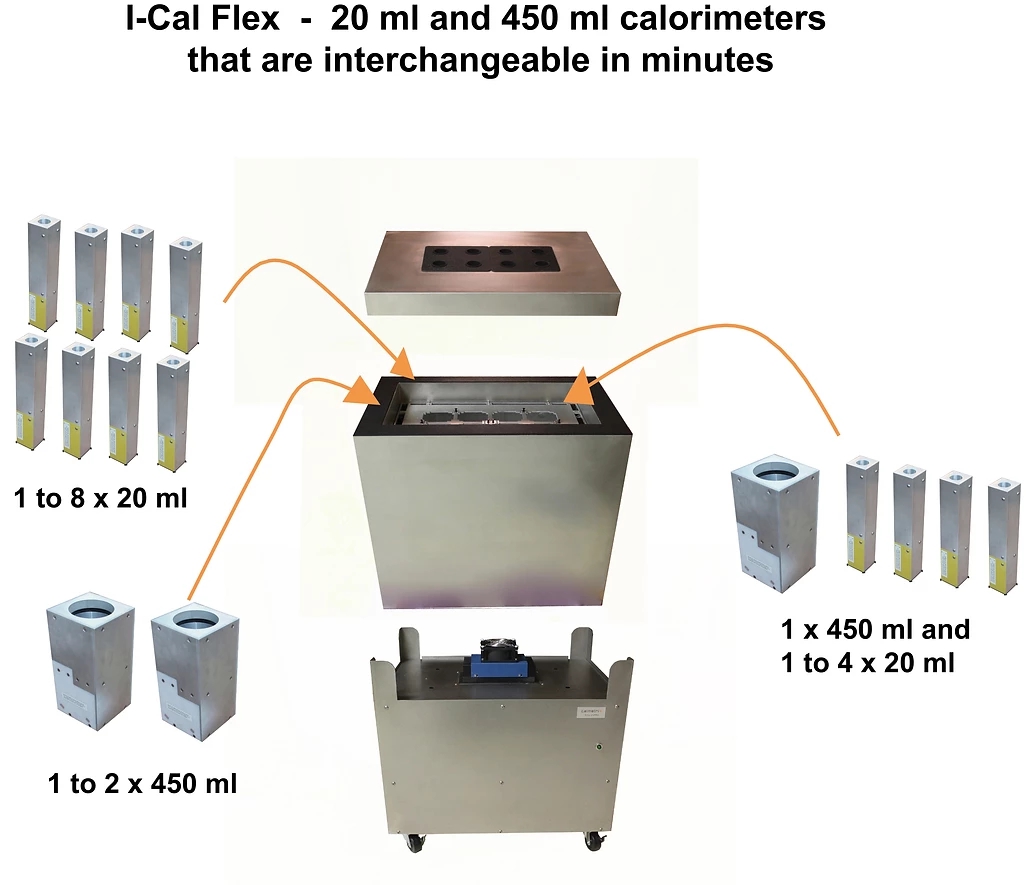 Das Calmetrix I-Cal Flex Multikanal-Kalorimeter kann individuell mit bis zu 8 Messkanälen mit max. 20 ml oder 2 Messkanälen bis 450ml bzw. in einer Kombination aus 4 Messkanälen mit 20 ml und einem mit 450 ml konfiguriert werden.