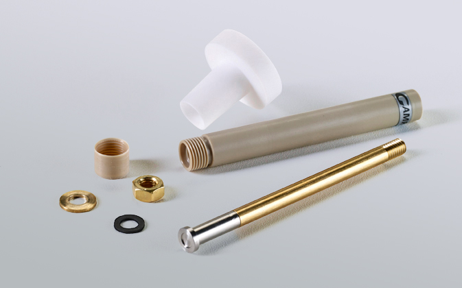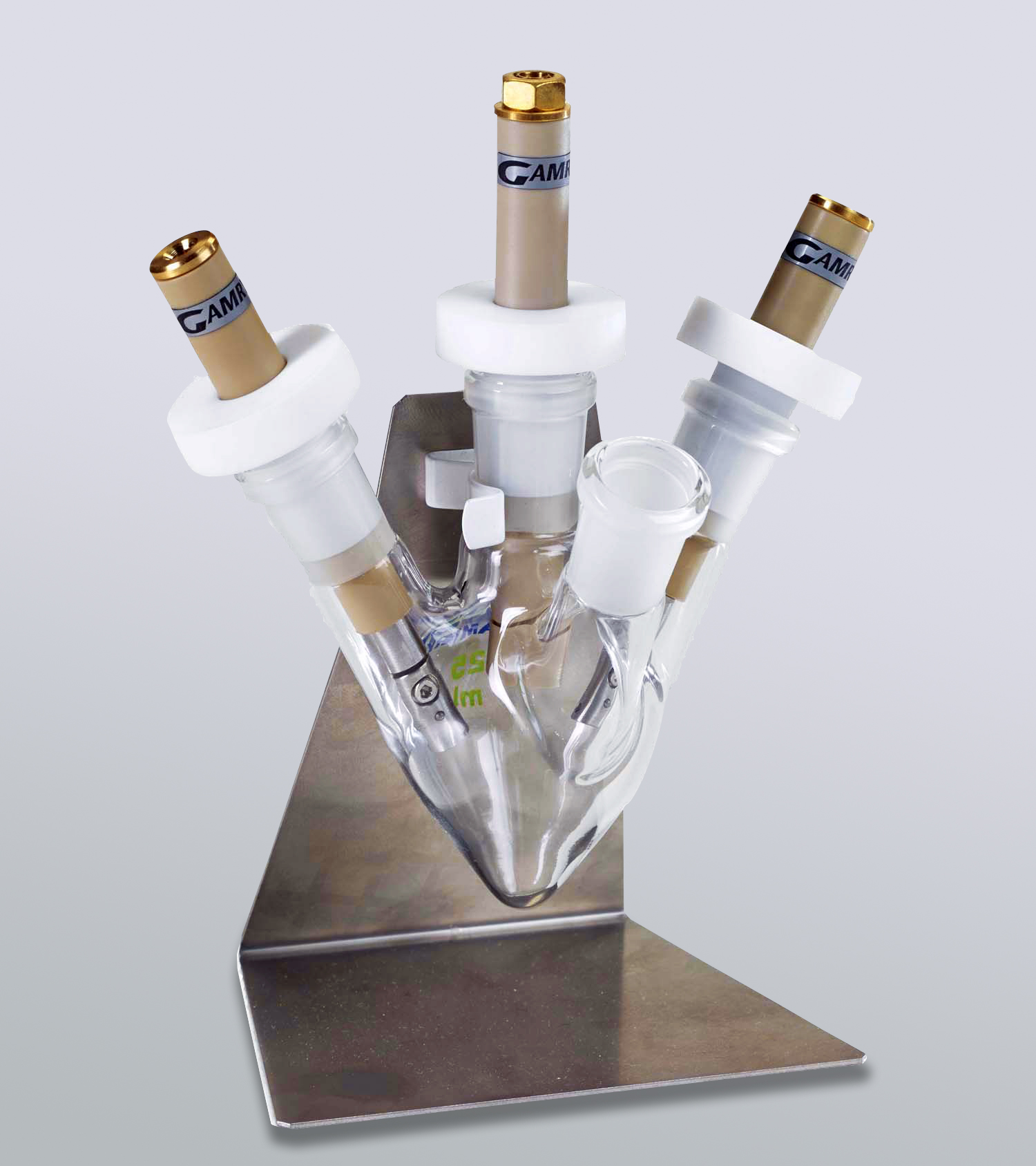 Die Evaluierungsmesszelle für Batteriematerialien (LIB) in der Ausführung „Halbzelle“ (990-00344 = Half Cell Kit) besteht aus einem großen Folienhalter für einen kreisförmigen Probenkörper und zwei kleinen Folienhaltern für Folien- oder Drahtmaterial. Dabei dienen die beiden kleinen Folienhalter für die Unterbringung einer Referenz- und einer Gegenelektrode. In dieser Konfiguration können individuell auf den kreisförmigen Probenkörper aufgetragene Anoden- und Kathodenmaterialien unabhängig voneinander untersucht werden.