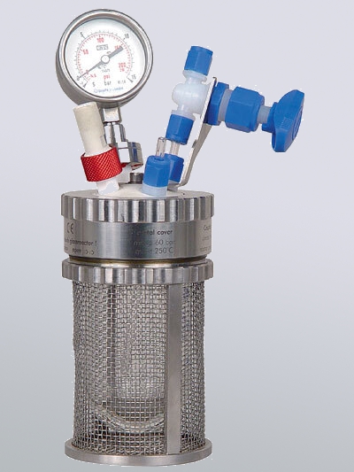 Der Borosilikat-Glasreaktor zeichnet sich durch eine hohe Säurebeständigkeit aus und ermöglicht visuelle Prozesskontrolle und Überwachung. Die 10 bar Glasreaktoren sind zwischen 100 und 300ml erhältlich (für kleinere Volumina ab 10ml siehe „tinyclave„) und optional auch gegen Stahlreaktoren bis 100 bar austauschbar. Zur Erhöhung der Korrosionsbeständigkeit sind die Stahlreaktoren auch mit PTFE-Inlinern verfügbar.