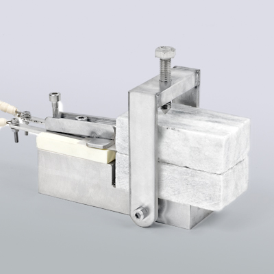 Bei der Hot Disk-Technik (auch „Transient Plane Source“ (TPS)-Verfahren) dient der flächige Sensor als Wärmequelle und als Temperaturfühler zugleich. Er wird bei Standardmessungen zwischen zwei – vom Material her identische – Probenstücke gelegt. Für diese und weitere Setups stehen verschiedene Probenhalter zur Verfügung. Im einfachsten Fall ist das eine Einspannvorrichtung für die Proben mit Fixierung für den Sensor.