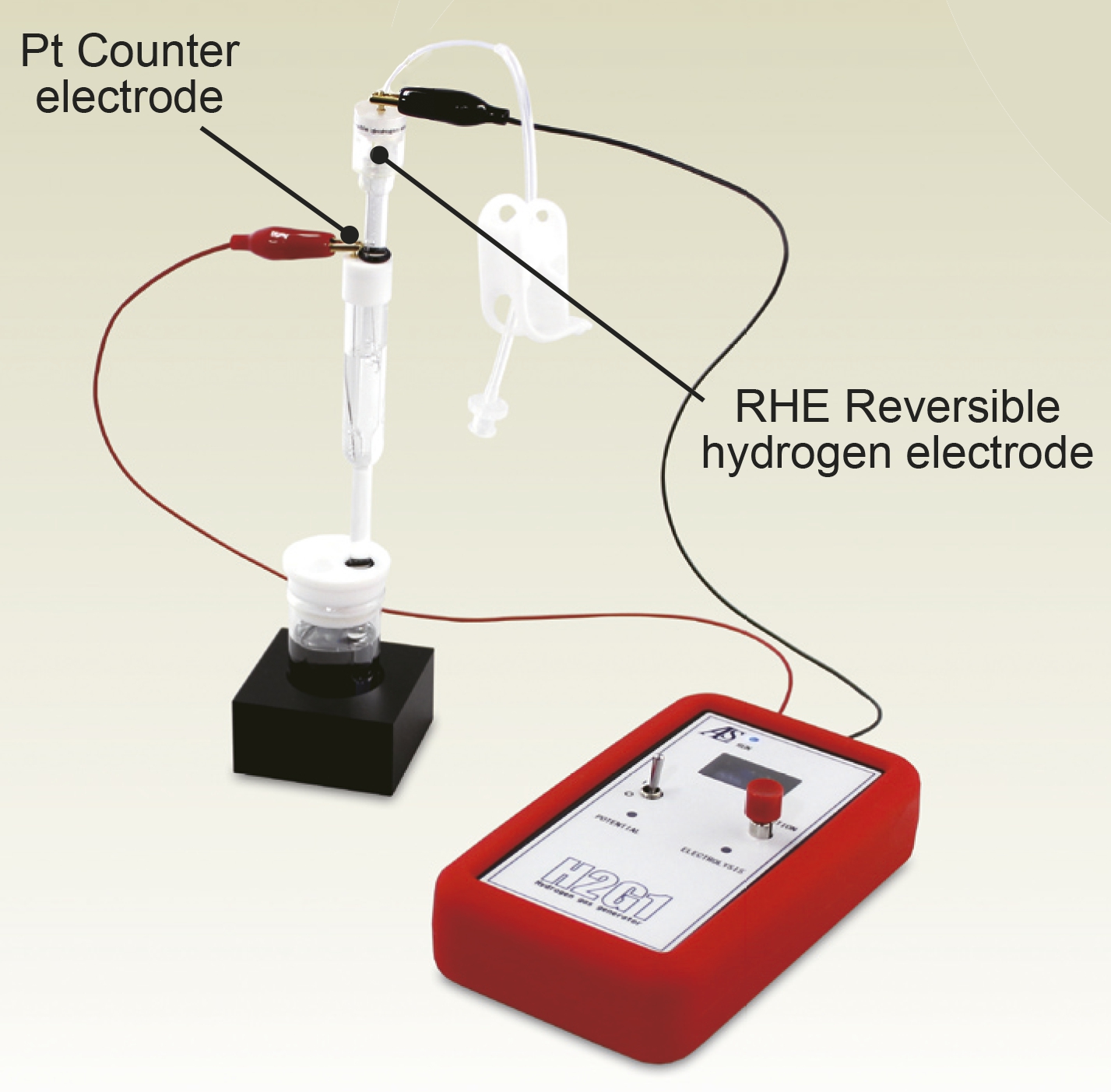 Der Portable Wasserstoffgenerator H2G1 wird verwendet um durch Elektrolyse Wasserstoff in der Reversiblen Wasserstoffelektrode (RHE) zu generieren. Die vielseitig verwendbare und sichere Reversible Wasserstoffelektrode (RHE) kann einfach nach der dem Generieren des Wasserstoffs mit dem Reversiblen Wasserstoffelektrodenkit RHEK eingesetzt werden. Das Potential der Reversible Wasserstoffelektrode ist sehr genau und stabil und kann daher auch zur Überprüfung des Potentials anderer Referenzelektroden oder als Ersatz für eine traditionelle Standard Wasserstoffelektrode (SHE) eingesetzt werden.