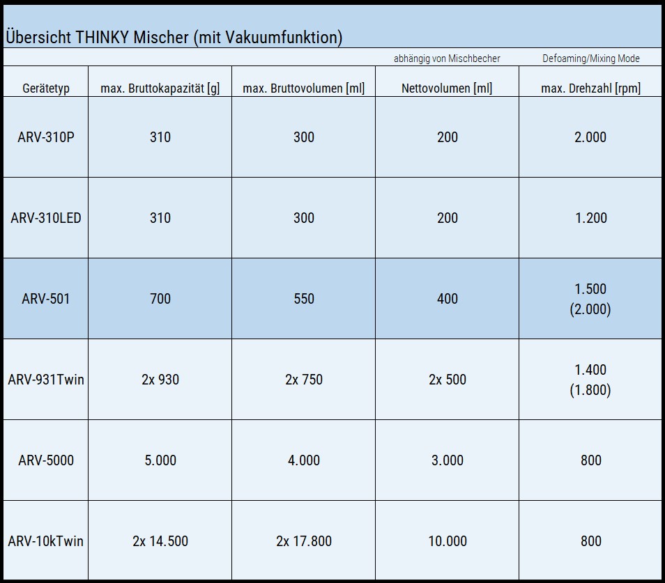 Der ARV-501 ähnelt dem ARE-500 vom Gehäuseaufbau, steht jedoch üblicherweise auf dem optionalen Unterbaugestell, in dem die Vakuumpumpe untergebracht ist. Dadurch ergibt sich einerseits, eine für den Anwender optimierte Bedienhöhe, andererseits ergeben sich durch die Einhausung – wie bei allen Thinky-Vakuummischern – verschiedene weitere Vorteile: