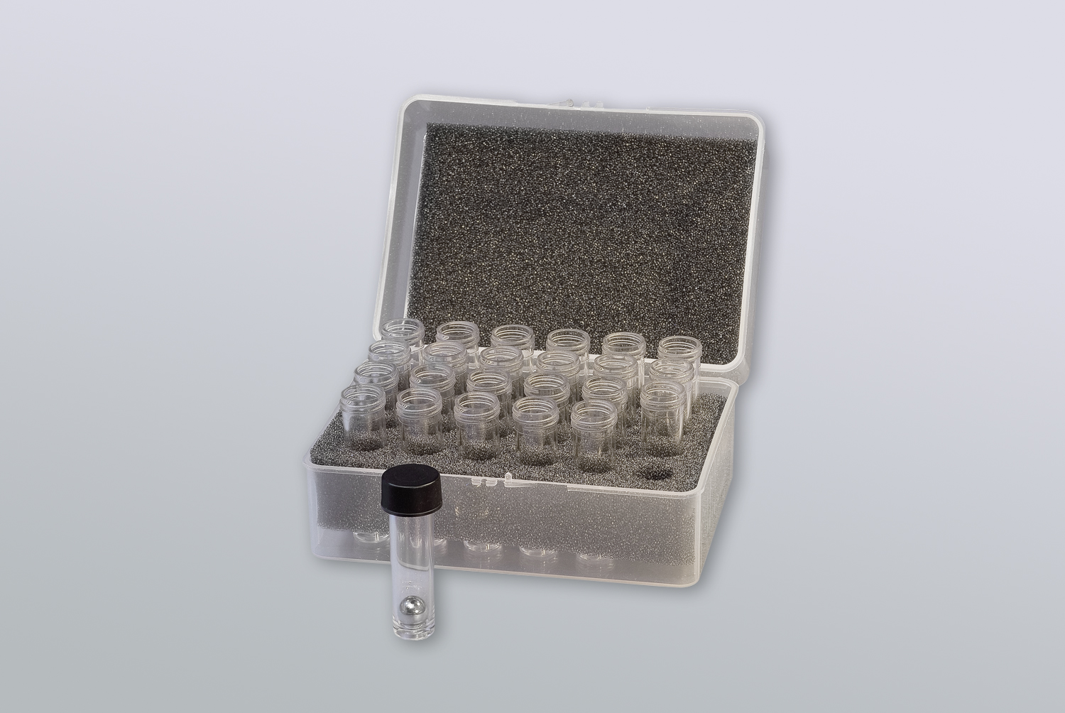• Unterschiedliche Mahlmedien (Edelstahl, Keramik, Silica, Zirkonoxid etc.) in verschiedenen Durchmessern und Formen (Perlen, Kugeln oder Stifte)